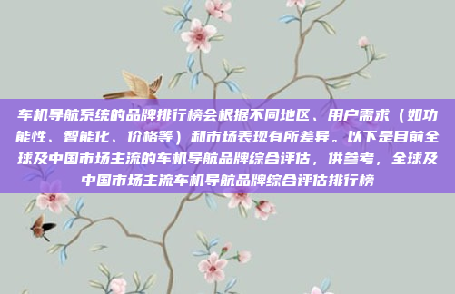![车机导航系统的品牌排行榜会根据不同地区、用户需求(如功能性、智能化、价格等)和市场表现有所差异。以下是目前全球及中国市场主流的车机导航品牌综合评估,供参考,全球及中国市场主流车机导航品牌综合评估排行榜]()