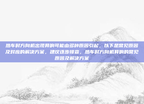 ** ,热车时方向机出现异响可能由多种因素导致,常见原因包括转向助力油不足或变质、转向系统部件(如万向节、拉杆球头)磨损、皮带松动或老化,以及方向机内部机械故障等,解决方案需逐步排查:首先检查助力油液位和质量,及时补充或更换;排查皮带松紧度及磨损情况,调整或更换;若异响持续,需检查转向拉杆、球头等部件是否松动或损坏,必要时维修或更换;对于内部机械故障,建议交由专业技师诊断处理,及时维护可避免安全隐患,确保行车安全。