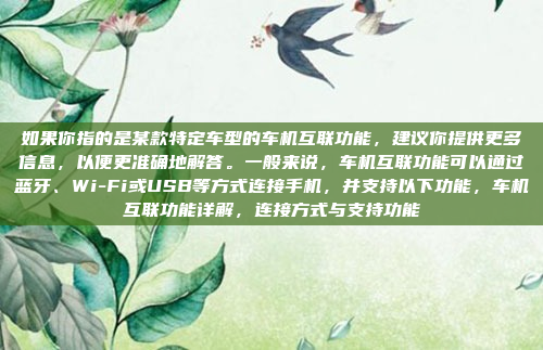 - 软件版本:部分车型可能需要更新至最新版本的CarPlay或CarLife功能,建议检查车辆信息或联系制造商确认。