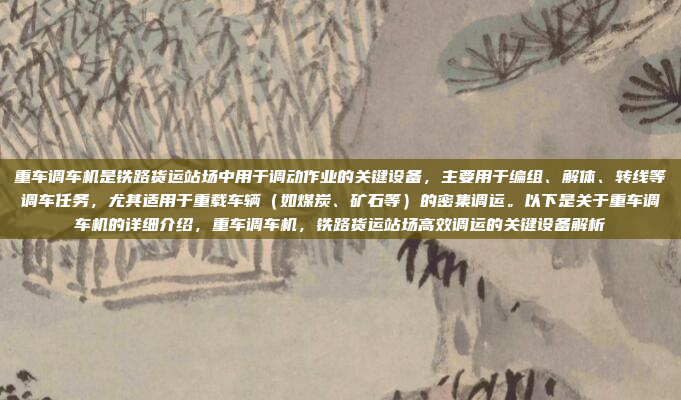 ![重车调车机是铁路货运站场中用于调动作业的关键设备,主要用于编组、解体、转线等调车任务,尤其适用于重载车辆(如煤炭、矿石等)的密集调运。以下是关于重车调车机的详细介绍,重车调车机,铁路货运站场高效调运的关键设备解析]()