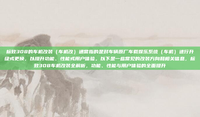 标致308的车机改装(车机改)是指对车辆原厂车载娱乐系统进行升级或更换,以提升功能、性能和用户体验,常见的改装方向包括更换更大尺寸的屏幕、升级车机系统以支持更多功能(如导航、蓝牙、车联网等)、增加智能语音控制、倒车影像优化以及音响系统的提升,部分改装还会更换原厂主机或加装高保真音响设备,以满足更高级的影音需求,一些改装方案还会保留车辆的原厂功能,如空调控制、仪表显示等,确保车辆的正常使用,在改装过程中,需注意选择与车辆兼容性较高的设备,并确保安装的稳定性和安全性,总体而言,车机改装不仅能提升驾驶体验,还能为车辆增添更多智能化功能。