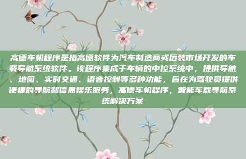 高德车机程序通过智能化的导航和信息娱乐功能,为驾驶者提供了高效、安全、便捷的驾驶体验,是现代车载系统的重要组成部分。