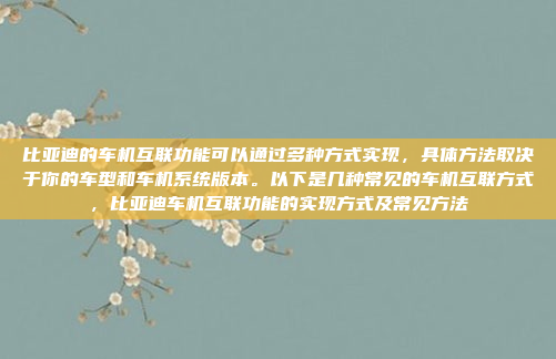 比亚迪的车机互联功能支持多种连接方式,具体取决于车型和车机系统版本,常见的连接方式包括蓝牙连接、数据线互联以及Wi-Fi连接,用户可以根据需求选择适合的互联方式,比亚迪还提供专属的账号登录和智能语音交互功能,进一步提升了车机互联的便捷性和智能化,这些功能不仅方便了用户的日常使用,还为驾驶体验带来了更多可能性。