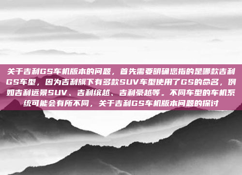 关于吉利GS车机版本的问题,首先需要明确您指的是哪款吉利GS车型,因为吉利旗下有多款SUV车型使用了GS的命名,例如吉利远景SUV、吉利缤越、吉利豪越等,不同车型的车机系统可能会有所不同,具体功能和版本信息需要根据实际车型来确定,建议您联系当地的吉利4S店或查看车辆的用户手册,以获取更准确的车机版本信息。