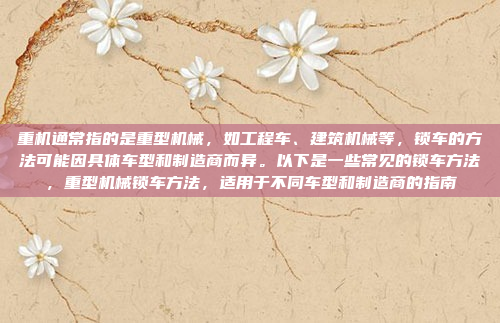 重型机械锁车方法因车型和制造商而异,但通常包括机械锁、电子锁、密码锁和钥匙锁等多种方式,这些方法旨在确保设备的安全性,防止未经授权的操作或盗窃,选择合适的锁车方式时,需考虑设备类型、使用环境和安全性需求。