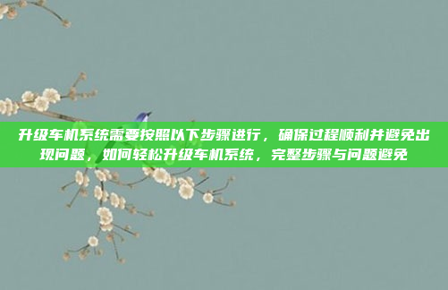 升级车机系统需要按照以下步骤进行,确保过程顺利并避免出现问题,备份重要数据,如音乐、导航地图和其他个性化设置,以防止数据丢失,确保车辆处于稳定的电源状态,断开外部设备,并将车辆停放在平坦、安全的地方,通过USB或Wi-Fi连接到电脑或手机,下载最新的系统固件,按照提示完成固件安装,耐心等待系统更新完成,更新完成后,重启车机系统,并检查功能是否正常,恢复之前备份的数据,确保系统恢复到最佳状态,在整个过程中,避免中途打断操作,确保网络连接稳定,以顺利完成升级。