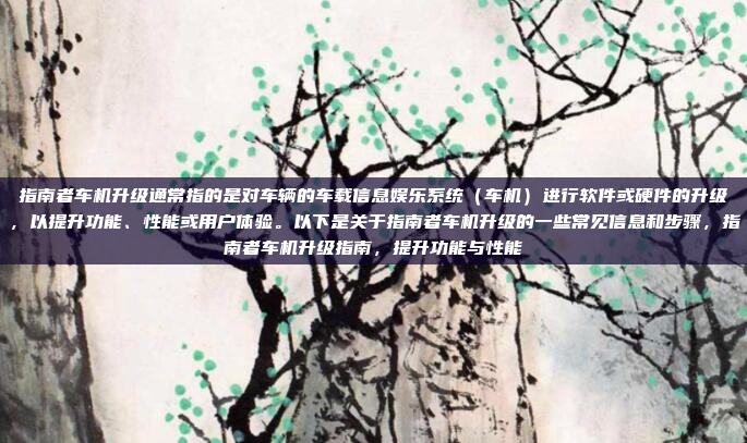 指南者车机升级是指对车辆的车载信息娱乐系统(车机)进行软件或硬件的升级,以提升功能、性能和用户体验,升级通常包括软件更新或硬件更换,旨在优化导航、多媒体娱乐、车辆控制等功能,升级可以通过原厂系统或第三方设备完成,具体步骤因车型和系统而异,升级前需注意断电操作以避免数据丢失,并确保使用兼容的升级工具,升级后,车主可享受更流畅的操作、更高的安全性和更智能化的驾驶体验。
