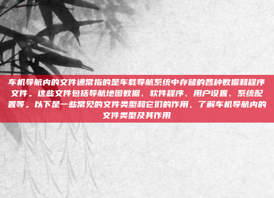 娱乐系统文件:如果车机导航系统也集成娱乐功能,如音乐、视频、蓝牙连接等,相关的媒体文件和配置文件也会存储在导航系统中。