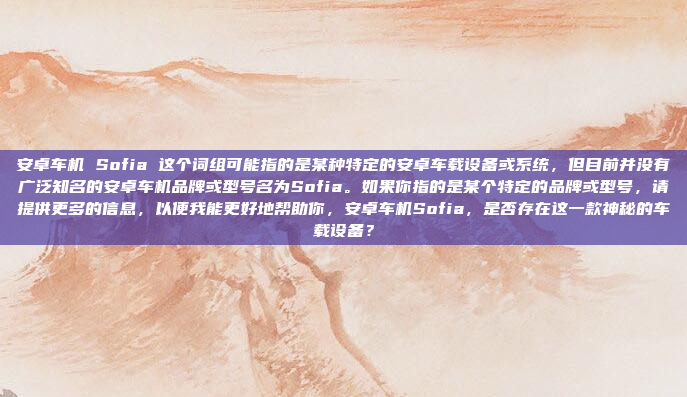 关于“安卓车机 Sofia”这一词组,目前并没有广泛知名的安卓车载设备或系统以“Sofia”为品牌或型号名称,如果你指的是某个特定的品牌或型号,请提供更多详细信息,以便我能够更好地帮助你。