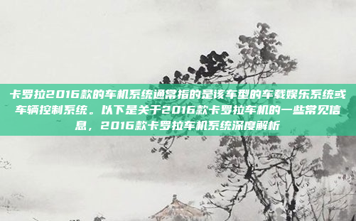 2016款卡罗拉的车机系统主要指其车载娱乐和车辆控制系统,通常包括中控屏幕、导航、蓝牙连接、USB接口等功能,该系统设计简洁,操作直观,支持多种娱乐和信息功能,满足日常驾驶需求,部分车型还配备了语音控制和车辆设置功能,进一步提升便利性,总体来看,2016款卡罗拉的车机系统在功能性和用户体验上表现良好,但相比 newer systems, 它在智能化和响应速度方面略显不足,用户普遍认为其界面友好,但在复杂操作时可能稍显迟缓。