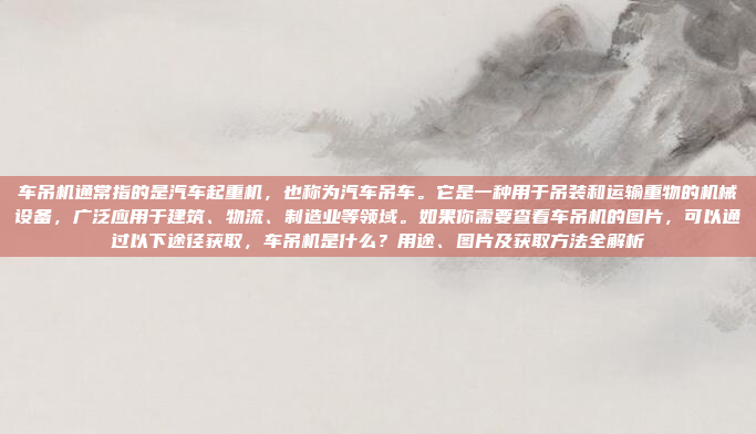 车吊机,即汽车起重机,是一种用于吊装和运输重物的机械设备,广泛应用于建筑、物流、制造业等领域,它具有机动性强、操作灵活的特点,能够满足多种场景下的起重需求,如果你需要查看车吊机的图片,可以通过以下途径获取:可以在互联网上搜索相关关键词,如“汽车起重机图片”,通过搜索引擎或图片网站找到大量相关图片;可以访问专业的机械设备制造商官网,通常会有产品展示页面;还可以在工程设备论坛或社交媒体平台上寻找用户分享的图片资源,这些途径都能帮助你方便地获取车吊机的图片。