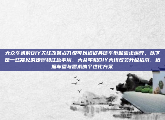 大众车机的DIY天线改装或升级可以根据具体车型和需求进行,以下是一些常见的步骤和注意事项:选择适合的天线类型,如高增益天线或吸盘天线,确保与车辆兼容,拆卸原装天线,注意断开电源并避免损坏原车电路,安装新天线时,确保固定牢固,位置合理以优化信号接收,连接线缆时,注意信号线的走向,避免干扰其他电子设备,完成安装后,测试信号接收效果,确保天线工作正常,改装时需注意选择与车辆匹配的天线,避免因不匹配导致信号不稳定,拆卸和安装过程中要小心操作,避免划伤车漆或损坏车身结构,线缆布置要尽量隐蔽,避免影响车内美观,建议使用专业工具和校准设备,确保天线性能达到最佳状态。