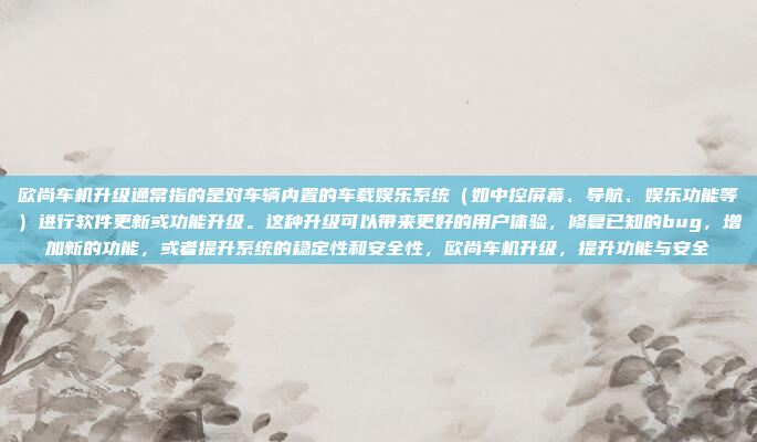 欧尚车机升级是指对车辆内置的车载娱乐系统(如中控屏幕、导航、娱乐功能等)进行软件更新或功能升级,这种升级旨在优化用户体验,修复已知的软件问题(如bug),并增加新的功能,通过升级,系统性能和稳定性得到提升,同时增强安全性,对于车主而言,车机升级不仅能够带来更流畅的操作体验,还能享受更丰富的功能和更高的安全性,从而提升驾驶乐趣和车辆整体价值。