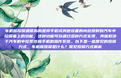 车机版投屏是一种将手机或其他设备的内容投射到汽车中控屏幕上的功能,通过有线或无线连接实现,常见的投屏方式包括使用手机的投屏功能(如苹果的AirPlay、安卓的无线显示)、第三方投屏软件,以及部分车载系统内置的投屏协议,这种方式不仅提升了车内娱乐体验,还方便了导航、信息查询等操作,为驾驶者提供了更多便利。