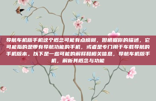“导航车机版手机”这一概念尚不明确,但根据描述,它可能指的是一种结合导航功能的手机,或专门用于车载环境的手机版本,这种手机可能具备以下特点:1)作为车载导航设备的替代品,支持高精度地图和实时路况;2)优化了车载环境下的使用体验,如大屏幕、语音控制等;3)可能与车载系统无缝连接,提供更智能化的导航服务,这类手机可能还支持其他车载功能,如多媒体娱乐、车辆状态监测等,尽管目前市场上尚未见到此类产品,但随着智能手机技术的不断发展,未来导航车机版手机或将成为一种新兴的车载设备形式。