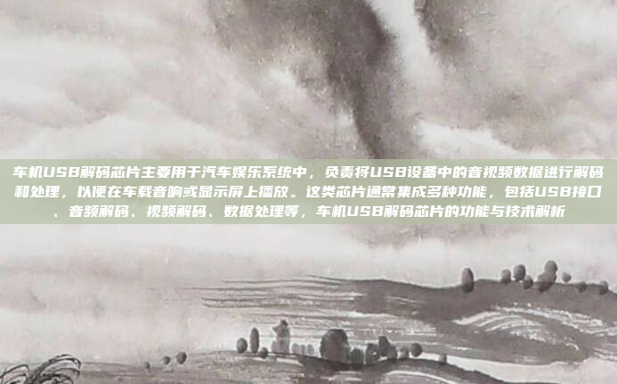 车机USB解码芯片是一种专门用于汽车娱乐系统的电子元件,主要用于处理和解码USB设备中的音视频数据,该芯片集成了多种功能模块,包括USB接口、音频解码、视频解码以及数据处理等,能够将存储在USB设备中的音视频内容转换为适合车载音响或显示屏播放的格式,这种芯片在汽车娱乐系统中扮演着重要角色,确保了用户通过USB设备享受高质量的音视频体验,其高效的数据处理能力和多功能集成设计,使得车机USB解码芯片成为现代车载娱乐系统不可或缺的一部分。