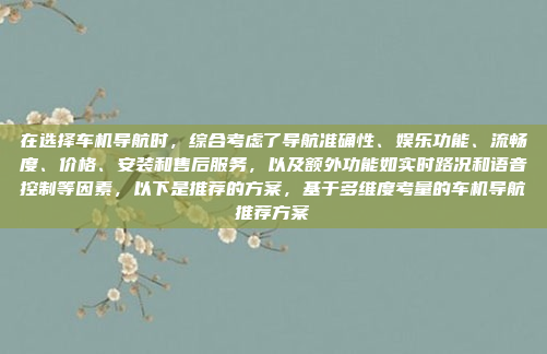 在选择车机导航时,需综合考虑多个关键因素,包括导航准确性、娱乐功能、系统流畅度、价格、安装便捷性、售后服务,以及实时路况更新和语音控制等附加功能,这些因素共同影响着用户体验和长期使用价值,基于这些考量,推荐选择一款性能稳定、功能全面且性价比高的车机导航设备,以满足日常驾驶和娱乐需求。