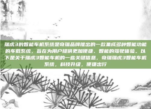 瑞虎3的智能车机系统是奇瑞品牌推出的一款集成多种智能功能的车载系统,旨在为用户提供更加便捷、智能的驾驶体验,该系统通过智能交互界面、语音控制、导航、娱乐功能以及与手机的无缝连接,为用户带来高效、安全的驾驶体验,其核心功能包括实时导航、语音识别、在线音乐和 podcasts、天气预报等,同时支持与手机的蓝牙连接和无线投屏,进一步提升驾驶便利性,瑞虎3的智能车机系统以用户需求为导向,结合奇瑞品牌的创新技术,为驾驶者打造了一个智能化、个性化的车载生态系统,满足了现代消费者对科技感和舒适性的追求。