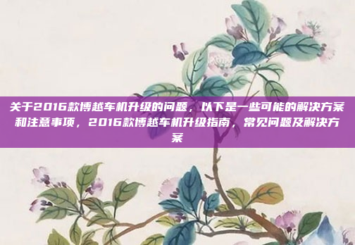 关于2016款博越车机升级问题,以下是主要解决方案和注意事项: ,升级可通过4S店、第三方服务商或自主刷机完成,每种方式各有优缺点,建议选择官方或 reputable渠道,以确保系统兼容性和安全性,升级前需备份重要数据,避免数据丢失,选择适合的刷机版本,并确保操作环境稳定,刷机工具需与车辆型号匹配,避免因工具不兼容导致问题,升级后需进行校准和测试,确保功能正常,操作时务必谨慎,建议非专业用户寻求专业帮助,以避免潜在风险。