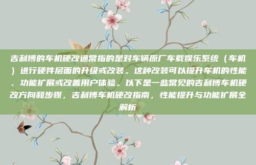 吉利博的车机硬改是指对车辆原厂车载娱乐系统(车机)进行硬件层面的升级或改装,旨在提升性能、扩展功能或改善用户体验,常见的改装方向包括更换更高性能的处理器、增加内存、升级显示屏或添加新的硬件模块(如更好的音响系统或更多传感器),改装步骤通常涉及拆卸原厂设备、安装新硬件以及进行软件适配和测试,这种改装需要一定的技术基础和专业知识,以确保兼容性和稳定性,通过硬改,用户可以实现更流畅的操作、更高的功能扩展性和更好的驾驶体验。