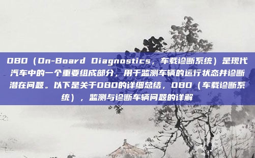 OBD(On-Board Diagnostics,车载诊断系统)是现代汽车中的一个重要组成部分,用于实时监测车辆的运行状态并诊断潜在问题,通过连接车辆的电子控制单元(ECU),OBD能够检测排放系统、发动机性能、催化转化器等关键部件的工作状态,并通过故障码和数据流提供详细的诊断信息,这种系统不仅有助于提高车辆的可靠性和环保性能,还能帮助车主及时发现并修复问题,避免进一步的损害,OBD的发展经历了多个阶段,从最初的排放监测功能逐步扩展到更全面的车辆诊断能力,随着技术的进步,OBD在提升车辆性能、减少排放和优化驾驶体验方面发挥着越来越重要的作用。