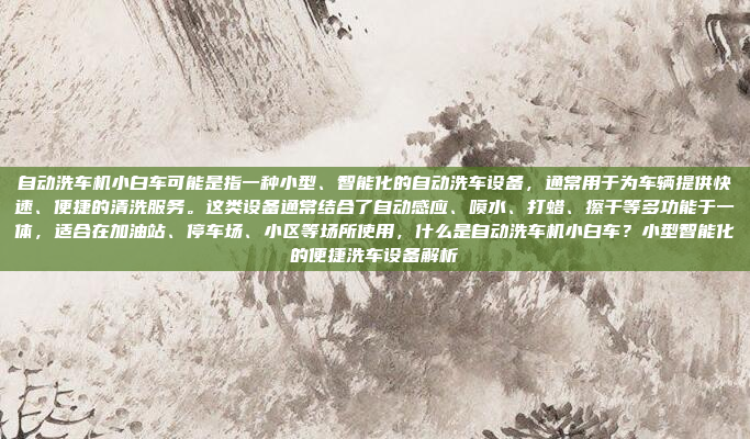 自动洗车机小白车是一种小型、智能化的自动洗车设备,旨在为车辆提供快速、便捷的清洗服务,它集成了自动感应、喷水、打蜡和擦干等多种功能,能够满足车辆清洗的多种需求,这种设备设计紧凑,适合在加油站、停车场、小区等场所使用,为用户提供高效、便捷的洗车体验。