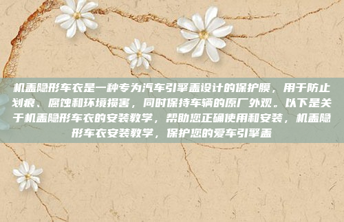 机盖隐形车衣是一种专为汽车引擎盖设计的保护膜,主要用于防止划痕、腐蚀和环境损害,同时保持车辆的原厂外观,它不仅能够有效保护引擎盖免受日常使用中的磨损,还能提升车辆的整体美观,以下是关于机盖隐形车衣的安装教学,帮助您正确使用和安装,通过遵循安装步骤,您可以确保车衣的正确贴合,从而获得最佳的保护效果和持久的美观,无论是新车还是已使用车辆,机盖隐形车衣都能为您的爱车提供专业的防护,延长其使用寿命并保持崭新外观。