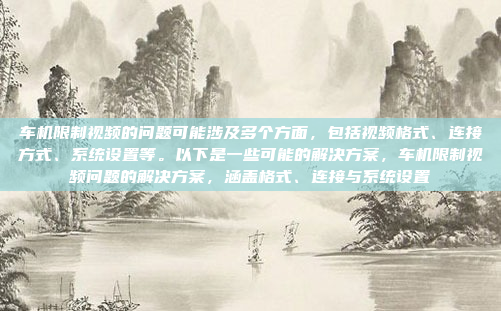 车机限制视频的问题可能与视频格式、连接方式或系统设置有关,为解决此问题,首先需确认视频格式是否符合车机支持的格式,如MP4、AVI等,并检查分辨率是否适配,检查连接设备的线缆是否正常,确保使用兼容的接口(如HDMI或USB),还需确认车机系统设置是否正确,包括视频输出模式和分辨率设置,若问题仍未解决,可尝试更新车机系统或固件至最新版本,以修复潜在的软件问题,通过以上步骤,大多数视频播放问题可得到解决。