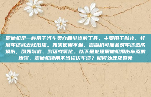 震抛机是一种用于汽车美容和维修的工具,主要用于抛光、打磨车漆或去除旧漆,如果使用不当,震抛机可能会对车漆造成损伤,例如划痕、剥落或氧化,以下是处理震抛机损伤车漆的步骤:立即停止使用震抛机,避免进一步损坏车漆,评估损伤程度,确定是否需要专业修复,使用细砂纸或抛光剂轻轻打磨受损区域,以去除轻微划痕或氧化层,对于较严重的损伤,可能需要使用研磨剂和砂纸进行深度修复,随后用抛光剂恢复光泽,建议定期检查车漆状态,并避免在高温或不平滑的表面上使用震抛机,以防止类似问题再次发生。