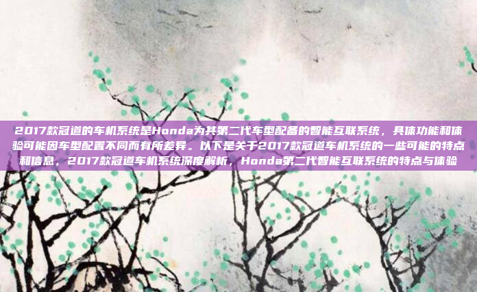 2017款冠道的车机系统是Honda为其第二代车型配备的智能互联系统,该系统旨在为驾驶者提供更智能化的车载体验,具体功能和体验可能因车型配置不同而有所差异,以下是关于2017款冠道车机系统的一些可能的特点和信息:Honda的智能互联系统可能包括导航、娱乐、语音控制、手机互联等功能,具体功能和操作体验会根据车辆的配置有所不同,高配车型可能配备更先进的功能,而低配车型可能仅提供基础的娱乐和导航功能,总体而言,2017款冠道的车机系统在智能化和用户体验方面有一定的提升,但具体表现还需根据实际配置和使用体验来评估。