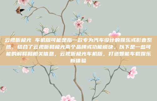 “云视听极光 车机版”可能是一款专为汽车设计的智能影音娱乐系统,结合了“云视听”和“极光”两个品牌或功能模块,该系统可能集成了影音娱乐、智能交互、多设备连接等功能,为驾驶者和乘客提供更丰富的车内体验,它可能支持高清影音播放、在线音乐、视频 streaming 等功能,同时具备良好的人机交互设计,方便用户操作,该系统可能还支持与手机、智能设备的无缝连接,进一步提升驾驶过程中的娱乐性和便利性,总体来看,“云视听极光 车机版”可能是为现代汽车量身打造的一款高效、智能的影音娱乐解决方案,旨在提升驾驶体验和影音享受。
