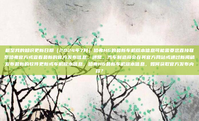 截至2024年7月,关于哈弗H6的最新车机版本信息,建议直接联系哈弗官方或访问其官方网站以获取最准确和最新的官方发布内容,汽车制造商会在其官方网站或通过新闻稿发布最新的软件更新或车机版本信息,建议您通过官方渠道查询相关详情,以确保获得可靠的信息。