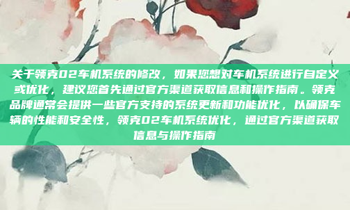 关于领克02车机系统的自定义或优化,建议用户优先通过官方渠道获取信息和操作指南,领克品牌通常会提供官方支持的系统更新和功能优化,以确保车辆性能和安全性,通过官方渠道进行操作可以避免因不当修改导致的潜在问题,同时确保系统兼容性和稳定性,建议用户在进行任何车机系统调整前,先查阅官方文档或联系售后服务,以获得专业指导和保障。