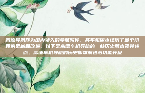高德导航是国内领先的导航软件,其车机版本经过多次更新和改进,不断提升用户体验和技术水平,从早期的基础导航功能到如今的智能化服务,高德车机导航经历了多个阶段的优化,早期版本注重基础导航功能,如实时路况和语音提示,为用户提供基本的驾驶辅助,随着技术进步,后续版本逐步引入了更智能的功能,如语音交互、在线更新和个性化设置,进一步提升了用户便利性,近年来,高德车机导航还加强了与智能汽车的深度整合,支持更多智能交互和生态服务,满足用户对科技化、便捷化出行的需求,这些版本的更新不仅体现了高德在技术上的不断突破,也反映了其对用户体验的持续关注,使其在车机导航领域保持领先地位。