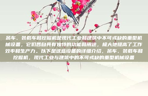 吊车、装载车和挖掘机是现代工业和建筑中不可或缺的重型机械设备,它们各自具有独特的功能和用途,极大地提高了工作效率和生产力,吊车主要用于重型物体的吊装和运输,广泛应用于建筑工地、港口和制造业;装载车则以其强大的装载能力和机动性,成为物料运输和装卸的关键设备,适用于矿山、建筑和物流领域;挖掘机则主要用于挖掘、破碎和装载作业,是建筑、采矿和市政工程中的重要工具,这些设备的高效性和可靠性显著提升了施工效率,缩短了项目周期,并为现代工业和建筑项目提供了强有力的支持。
