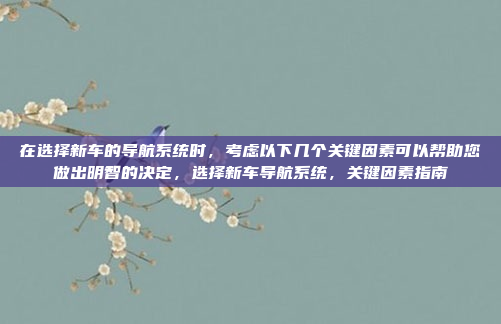 在选择新车的导航系统时,有几个关键因素需要考虑以做出明智的决定,导航系统的屏幕尺寸和分辨率非常重要,较大的屏幕和高分辨率可以提供更好的用户体验,导航软件和地图更新的频率也是关键,确保地图数据及时更新以保证导航的准确性,语音控制和与车辆其他系统的集成度也会影响使用体验,方便驾驶员操作,实时交通功能是一个加分项,能够帮助避开拥堵路段,友好的用户界面和操作逻辑可以提升使用便捷性,兼容性也是一个重要考虑因素,确保导航系统能够与手机和其他设备无缝连接,品牌和可靠性同样不可忽视,选择知名品牌可以提供更好的售后服务和技术支持,综合考虑这些因素,并根据预算做出选择,将帮助您找到最适合的导航系统。