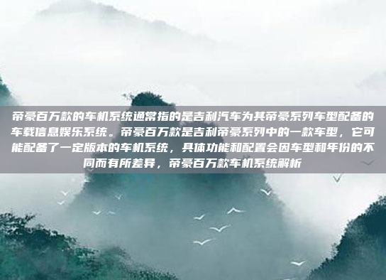 帝豪百万款是吉利汽车帝豪系列中的一款车型,其车机系统通常指该车型配备的车载信息娱乐系统,该系统为驾驶者提供信息娱乐、导航、车辆控制等功能,具体配置和功能因车型和年份不同而有所差异,帝豪百万款作为吉利帝豪系列的一员,其车机系统旨在提升驾驶体验和车辆智能化水平,为用户带来更便捷的出行体验。