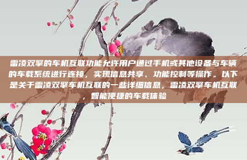 车机互联功能通过车载系统的屏幕和手机应用,提供多种智能化服务,包括但不限于导航、娱乐、车辆状态监控等,借助先进的智能交互技术,用户可以通过语音或触控操作,实现手机与车载系统的无缝连接,从而享受更加智能化、个性化的驾乘体验。