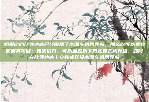 如果你的比亚迪唐已经配备了高德车机版导航,可以直接使用其功能;如果没有配备,可以通过以下方式安装或升级:一种是通过4S店或授权服务中心进行升级,另一种是通过手机连接蓝牙或Wi-Fi进行在线升级,用户还可以通过比亚迪的官方APP获取更多关于高德车机版导航的安装和使用支持。