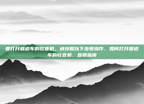 要打开霸道车的收音机,请按照以下步骤操作:,1. 确保车辆已启动 ignition(点火开关处于ON位置)。,2. 如果您的车辆配备有收音机的实体按键或旋钮,请找到收音机的电源开关或音量旋钮。,3. 轻轻旋转或按下开关,直到收音机显示信号或播放声音。,4. 如果您的车辆没有实体按键,而是通过触摸屏操作,请进入车辆的中控系统,找到“设置”或“音频”选项。,5. 在音频菜单中,找到“收音机”功能并启动。,请根据您的车辆型号和配置,参考车辆手册或咨询4S店以获取更详细的指导。