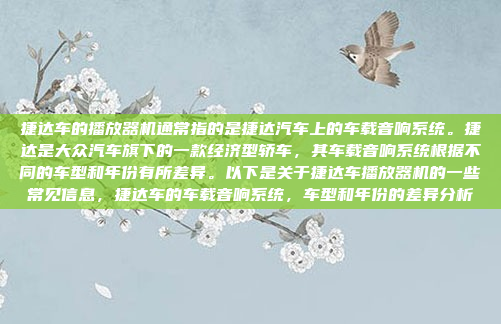 捷达车的播放器机通常指的是捷达汽车上的车载音响系统,捷达是大众汽车旗下的一款经济型轿车,其车载音响系统根据不同的车型和年份有所差异,早期的捷达车型可能配备较为基础的音响设备,而较新款车型则可能提供更高品质的音响系统,甚至支持蓝牙连接、USB接口等功能,以满足现代驾驶者的娱乐需求,部分高端配置的捷达车型还可能配备多扬声器、低音炮等音响升级选项,进一步提升音质体验,总体而言,捷达的车载音响系统在不同车型和年份之间存在一定的差异,消费者可以根据自身需求选择适合的配置。