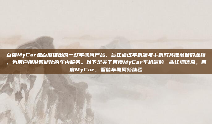 百度MyCar是百度推出的一款车联网产品,旨在通过车机端与手机或其他设备的连接,为用户提供智能化的车内服务,该产品通过车机端与智能设备的无缝连接,为用户打造了一个智能化的车内生态系统,用户可以通过车机端与手机或其他设备的联动,享受包括语音交互、智能导航、娱乐影音、车辆状态监控等在内的多种服务,百度MyCar通过整合百度的AI技术和大数据能力,进一步提升了驾驶体验和车辆管理的智能化水平,为用户带来更加便捷、安全和高效的出行体验。