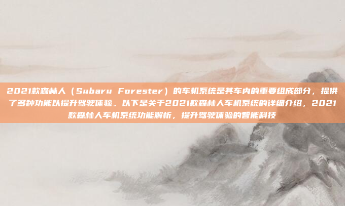 2021款森林人(Subaru Forester)的车机系统是其车内的重要组成部分,为驾驶者提供了丰富的功能,旨在提升驾驶体验,该系统集成了先进的信息娱乐系统,支持导航、语音控制、Apple CarPlay和Android Auto等智能手机连接功能,方便用户在驾驶过程中轻松操作,车机系统还配备了多种安全功能,如紧急呼叫和车辆诊断,进一步保障了行车安全,整体而言,2021款森林人的车机系统通过智能化和人性化的设计,为用户提供了更加便捷和安全的驾驶体验。