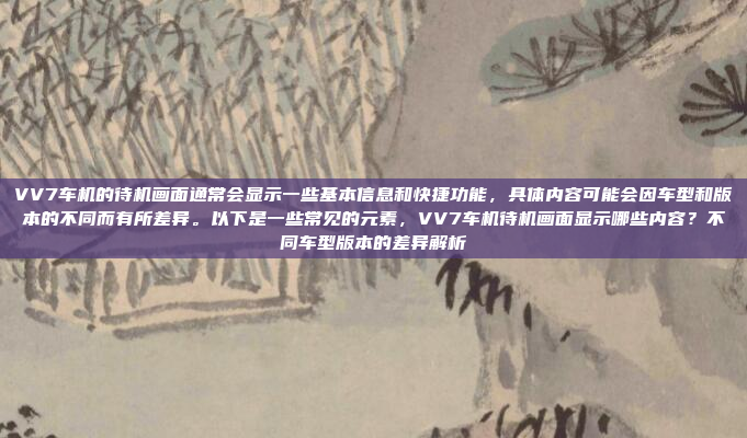 VV7车机的待机画面通常会显示一些基本信息和快捷功能,具体内容可能会因车型和版本的不同而有所差异,以下是一些常见的元素:时间、天气、车辆状态等基本信息,以及导航、音乐、空调控制等快捷功能,这些设计旨在为用户提供便捷的操作体验,同时保持界面简洁直观,不同车型和版本的VV7可能会在显示内容和功能布局上有所调整,以满足不同用户的需求和偏好,总体而言,VV7车机的待机画面注重实用性和美观性,为驾驶者提供了高效的信息展示和操作界面。