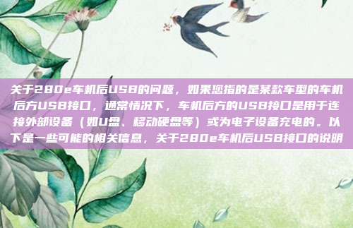 关于280e车机后USB的问题,通常情况下,车机后方的USB接口用于连接外部设备(如U盘、移动硬盘)或为电子设备充电,该接口的主要功能是提供数据传输和充电支持,具体用途取决于车辆的配置和设计,如果您有更多关于该接口的特定问题,请提供更多详细信息以便进一步解答。