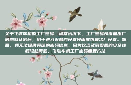 飞歌车机的工厂密码是设备出厂时的默认密码,主要用于进入设置界面或恢复出厂设置,由于涉及设备安全性和用户隐私,无法提供具体的密码信息,工厂密码的作用是保障设备在出厂时的初始设置和功能正常运行,但其具体数值通常由制造商内部掌握,以确保设备的安全性和防止未经授权的访问,用户在使用过程中应遵循设备的操作指南,并注意保护设备的设置信息,以避免潜在的安全风险。