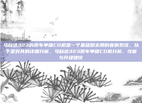 马自达323的原车单碟CD机是一款基础但实用的音响系统,设计简洁,适合日常使用,它支持CD、MP3等格式播放,功能较为基础,但能满足基本的听音需求,音质表现中规中矩,适合播放流行、轻音乐等类型,低音表现适中,整体清晰度不错,对于预算有限的用户来说,这款CD机性价比高,能够提供不错的听音体验,对于追求更高音质或更多功能的用户,可能需要考虑升级音响系统。