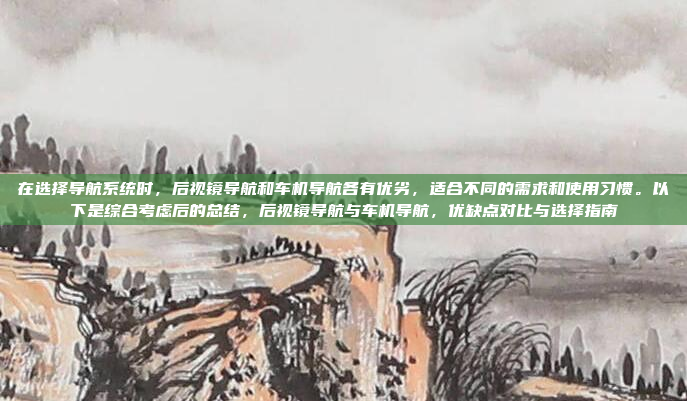 在选择导航系统时,后视镜导航和车机导航各有优劣,适合不同的需求和使用习惯,后视镜导航体积小巧,安装方便,适合不想改动车内结构的用户,但其屏幕较小,操作相对复杂,导航功能可能较为有限,而车机导航通常与车辆中控系统集成,屏幕更大,功能更全面,支持更多智能化操作,但安装可能需要改动车内线路,价格也相对较高,综合来看,选择导航系统应根据个人的使用习惯、功能需求以及预算来决定,以满足日常驾驶的便利性和舒适性。