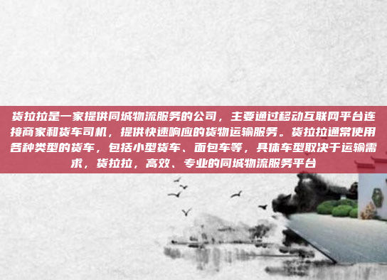 货拉拉是一家专注于同城物流服务的企业,通过移动互联网平台高效连接商家与货车司机,提供快速响应的货物运输解决方案,公司根据不同的运输需求,灵活选择小型货车、面包车等多种车型,满足多样化的物流需求,货拉拉凭借其便捷、高效的服务模式,成为众多商家和个人信赖的同城货运平台。