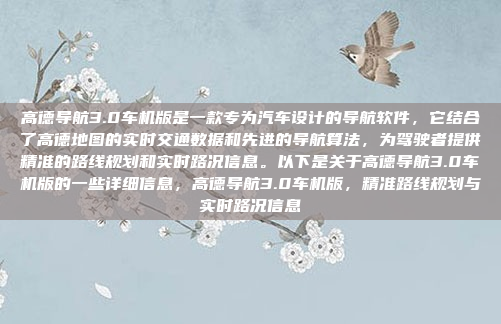 - 高德导航3.0车机版采用了先进的智能算法,能够根据实时路况和用户需求动态调整导航策略,提供更精准的导航服务,通过机器学习技术预测交通流量变化,提前规划最优路线。
